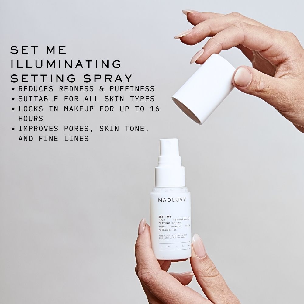 Set Me Illuminating is an ultra-nourishing, alcohol-free 3 in 1 setting spray that sets, nourishes, and seals makeup all day without melting, fading, or settling in fine lines. The high-performance formula soothes with rose water and hydrates with hyaluronic acid leaving your skin looking more radiant and visibly smoother than before.